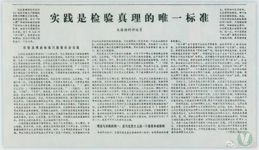 5月10日 中共中央黨校內(nèi)部刊物《理論動(dòng)態(tài)》第60期發(fā)表經(jīng)胡耀邦審定的《實(shí)踐是檢驗(yàn)真理的唯一標(biāo)準(zhǔn)》一文。11日,《光明日?qǐng)?bào)》以特約評(píng)論員名義發(fā)表此文。此后,在鄧小平領(lǐng)導(dǎo)、支持下,關(guān)于真理標(biāo)準(zhǔn)問(wèn)題的討論在全國(guó)展開(kāi),為中共十一屆三中全會(huì)作了重要的思想準(zhǔn)備,對(duì)黨和國(guó)家的歷史進(jìn)程產(chǎn)生了重大而深遠(yuǎn)的影響。